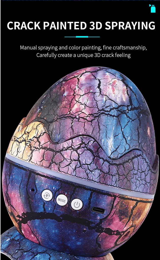 على شكل بيضة ديناصور، يضفي هذا الضوء الليلي لمسة من المغامرة إلى أي غرفة. يكشف تصميم البيضة المتشققة عن توهج داخلي ساحر، يذكرنا بفقس الديناصور الذي يخرج من قشرته.
